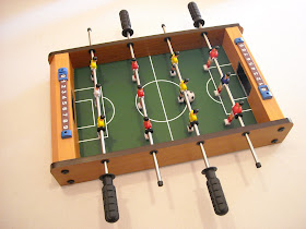 Siempre que nos reunimos los colegas en algun bar o local que tenga un futbolín de monedas acabamos liados en un animado torneo entre pique y risas... Hace poco me regalaron un mini futbolín de madera de 2 barras por jugador. Es muy ràpido, adictivo y se obtiene un buen control de la pelota.